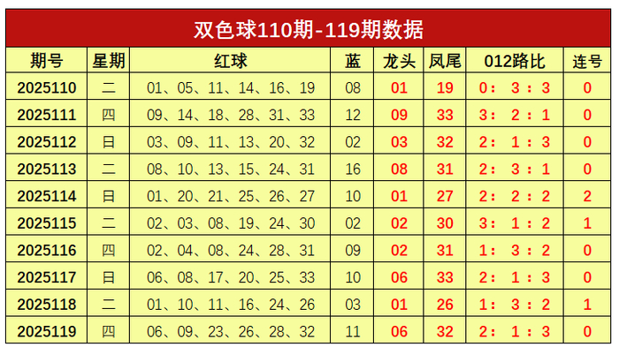 双色球第2025119开奖奖号:红球06、09、23、26、28、32,蓝球11。龙头06,凤尾32,012路比为2:1:3,未开出连号。