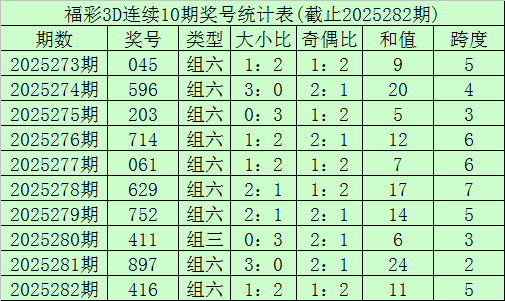 百位号码:第25278期-25282期奖号为:6-7-4-8-4,振幅为4点,奖号比拟蚁集,本期展望百位走高,心绪号码9。 十位号码:前5期奖号开出:2-5-1-9-1,奖号大小比开出2:3,小 号领会热出,短期内不会转冷,本期心绪号码0。 个位号码:联结5期开出奖号:9-2-1-7-6,奖号奇偶比开出3:2,偶数出现较少,本期防护回补,看好号码2。 跨度:前5期跨度在2-7之间波动,振幅为6点,散布较广,上期开出跨度5,走高3点,本期展望跨度走高,心绪跨度9。 和值:前5期和值在6-24之间波动,振幅为19点,开出范畴较广,上期和值为11,着落13点,本期看重上期和值重叠出现。