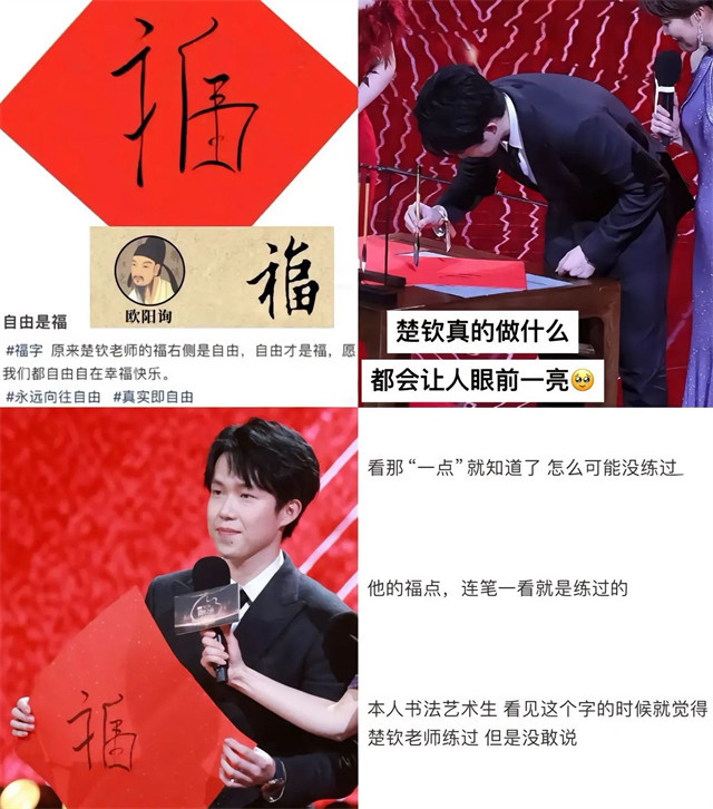 还有东谈主解读,王楚钦摹仿的“福”字,有卓著的深意,左半部分像“王”字,字的右半部分则像是“解放”二字的合写,寓意着王楚钦但愿我方大约得到解放。关于铁粉的解读,世东谈主天怒人怨,有的粉丝恍然大悟立马传颂起来,但还有一些东谈主以为这完全即是在吹捧,拿王楚钦对比欧阳询即是在侮辱书道世界,甚而是在侮辱书道。