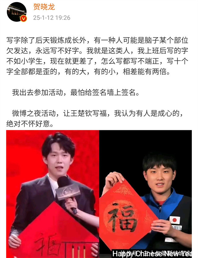 甚而,还有网友把王楚钦和张本智和各自写的福字放在一皆比拟。张本智和诚然从小在日本长大接管当地教养,关联词他写的福字反而看上去更清翠有好意思感,这么一比,似乎王楚钦还不如一个日本华侨选手的汉字水平高,从而激发群嘲,他被以为是没文化、弄斧班门。